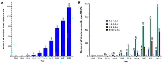 In this context, single-particle cryo-electron microscopy (cryo-EM SPA) has emerged as an exceptionally suitable technique for determining the structure of MPs. Unlike X-ray crystallography, cryo-EM SPA eliminates the need for crystal formation, requires much smaller sample quantities, and allows the use of a wide variety of hydrophobic environments [6,7]. The impact of cryo-EM SPA on the field of studying the structural biology of MPs can be illustrated by some numbers since the first atomic structures of a MP were determined through the use of this technique in 2013 [8,9]. While the use of X-ray crystallography has yielded a total of 5,828 deposits of MP structures in the Protein Data Bank (PDB) in all history, cryo-EM SPA has led to 3,556 deposits of MP structures in just the last ten years (2013–2022). Notably, this huge progress has been concentrated in the last four years (2019–2022; Figure 1A), which account for 90% of the total number of cryo-EM SPA deposits of MP structures. Furthermore, there has been a remarkable increase in MP structures solved through the use of cryo-EM SPA at better than 3.0 Å resolution in the last three years (a 174% increase in 2022 compared to 2020; Figure 1B), with 11 structures reaching better than 2.0 Å resolution appearing in the last two years.