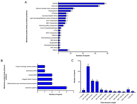 Family and size total structure weight distribution of the unique reports of membrane proteins whose structure has been solved at a resolution better than 3 Å by cryo-EM SPA during the last two years (2021–2022) available in the Protein Data Bank. (A) Family groups of α-helical MPs. Other include a single report for the following families: Adventitious MPs/α -helical pore-forming toxins; Bacterial rhodopsin; Wntless (WLS Transporters); Chain length determinant and associated proteins; Sterol-sensing domain (SSD) proteins; Energy-coupling factor (ECF) transporters; Host-defense proteins; Cellulose synthase; Autoinducer exporters; Amino acid secondary transporters; Yellow stripe 1 transporter; Sec, translocase, and insertase proteins; Antiporters; Cysteine proteases; and PIN-FORMED (PIN) proteins. (B) Family groups of β-barrel MPs. β-barrel MPs family includes one report of porins and relatives and one of monomeric/dimeric. Adventitious MPs included a report of β-sheet pore-forming toxins/attack complexes. (C) Total structure weight distribution of all unique reports of membrane proteins identified in this work. Total structure weight comprises the molecular weight of all non-water atoms in the PDB deposited model. The family groups were classified according to the family name provided by the mpstruc database (https://blanco.biomol.uci.edu/mpstruc/ accessed on 14 August 2023). GPCRs: G-protein coupled receptors; SLC: solute carrier; ABC: ATP-binding cassette; PTS: phosphoenolpyruvate-dependent phosphotransferase: MFS: major facilitator superfamily; SSS: solute sodium symporter; APC: Amino Acid/Polyamine/Organocation.