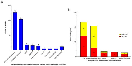 Although DDM is still the most widely used detergent for membrane protein extraction, even for cryo-EM studies, its once clear dominance seems to have slightly decreased in recent years. In comparison to a previous report [22], our analysis focusing on high-resolution cryo-EM structures, indicates a slight decrease in DDM usage from membrane protein extraction (~41% compared to ~43% from the previous report) and a significant rise in the utilization of detergents from the MNG family, particularly LMNG (~34% compared to ~22% from the previous report). Originally employed with remarkable success for the solubilization and stabilization of GPCRs (G protein-coupled receptors) in comparison to DDM [30], the utilization of LMNG has extended to numerous other classes of membrane proteins, as shown by our data and the existing literature [26]. A relevant practice worth highlighting is the addition of cholesteryl hemisuccinate (CHS) to detergent-solubilized MPs. CHS is a water-soluble cholesterol analog able to provide a more native and stabilizing environment for many purified MPs [32,33]. This addition of CHS has been reported mostly in combination with detergents from the MNG family, especially LMNG [74 of the 104 reports using MNG detergents (71%) contain CHS; Figure 3B].
