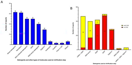 The combination of different detergents can be useful to explore their stabilizing properties of detergent–protein and detergent–detergent interactions and increase the effectiveness of the surfactant power obtained from this association without denaturing the membrane proteins. Strong detergent–protein interactions enhance membrane protein stabilization, and strong detergent–detergent interactions prevent protein aggregation and may minimize protein denaturation [26]. However, it is important to note that excessively strong detergent–protein interactions can lead to protein denaturation [35]. In the case of association between LMNG and GDN, LMNG interacts more strongly with the hydrophobic surface of MPs than DDM, GDN and digitonin due to its two alkyl chains, providing a strong detergent–protein interaction but without causing protein denaturation [26]. On the other hand, GDN has similar effects on protein–detergent interactions than DDM; however, the rigid hydrophobic group, resulting from the presence of a steroidal unit, promotes enhanced detergent–detergent interactions than LMNG [26]. It is important to note that the addition of CHS to detergent-solubilized MPs was mostly reported when the mixture of LMNG and GDN was employed at the vitrification step (44 out of the 47 reports, 93%) (Figure 5B). In comparison to the protein membrane extraction step, the addition of CHS is also extensively adopted in combination with detergents from the MNG family (23 out of 40 reports, 57%) (Figure 5B).