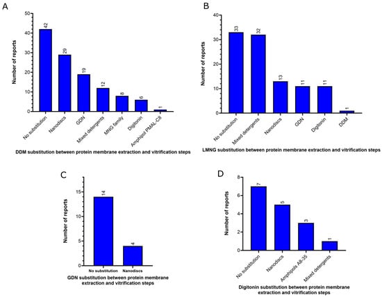 As mentioned above, a surfactant exchange or nanodiscs reconstitution step is frequently realized after membrane extraction and prior to vitrification of the membrane protein samples. There is a strong decrease in the use of DDM and LMNG (when used alone, without mixing with another detergent) in the vitrification step. Analysis of the substitutions among the four most common surfactants (DDM, LMNG, GDN and digitonin) used for membrane protein extraction revealed that DDM had the highest rate of exchange prior to the vitrification steps. Out of the 117 unique reports that used DDM for membrane protein extraction, only 42 retained it for the vitrification step (Figure 7A), representing a 65% replacement of DDM. The most frequently used substitute for DDM in the vitrification step was nanodiscs (29 unique reports), followed by GDN (19 unique reports), association between detergents (12 unique reports), detergents from the MNG family (8 unique reports), digitonin (6 unique reports), and amphipol PMAL-C8 (one unique report) (Figure 7A). Interestingly, in all cases but one, where DDM was present in the vitrification step, it was also employed for protein extraction from the membrane. Regarding LMNG, of the 101 unique reports that used this detergent for membrane protein extraction, 33 retained it as the sole surfactant in the vitrification step (Figure 7B). Although the use of LMNG alone has significantly decreased in the vitrification step, it has not been completely replaced. Instead, in 32 unique reports, LMNG was used in combination with other detergents, with 30 reports including a combination of LMNG and GDN and 2 combining LMNG with both GDN and digitonin. Thus, LMNG was completely exchanged before sample vitrification in 36 out of the 101 unique reports (35% of total replacement). The most common substitute for LMNG in the vitrification step was nanodiscs (13 unique reports), followed by GDN (11 unique reports), digitonin (11 unique reports) and DDM (1 unique report) (Figure 7B). GDN was less exchanged between membrane protein extraction and the vitrification steps. Out of the 18 unique reports that utilized this detergent for membrane protein extraction, it was exchanged before sample vitrification in only four cases, all of which were nanodiscs (22% replacement) (Figure 7C). Regarding digitonin, out of the 16 unique reports that used this detergent for membrane protein extraction, 7 retained it as the sole surfactant in the vitrification step, and 1 used it in combination with GDN. In three cases, digitonin was replaced by Amphipols A8-35, and in five cases, it was replaced by nanodiscs before sample vitrification (50% of total replacement) (Figure 7D). This high level of detergent exchange for detergent-free environments, particularly MSP-based nanodiscs, can be attributed to the complications that detergents can cause when aiming for high-quality cryo-EM images, including the introduction of detergent artifacts, increased vitrified ice thickness, and particle distribution and preferred orientational issues [53].