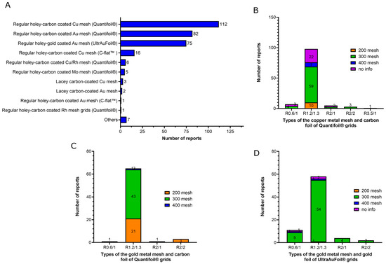 Profile of the grids used for determination of membrane protein structures solved by using cryo-EM single-particle analysis below 3.0 Å resolution in the last two years (2021–2022) available in the Protein Data Bank. (A) Type of the grids employed; (B) types of the cooper metal mesh and carbon foil of Quantifoil® grids; (C) types of the gold metal mesh and carbon foil of Quantifoil® grids; (D) types of the gold metal mesh and gold foil of UltrAuFoil® grids.