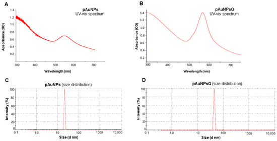 Characterization of plant cell derived gold nanoparticles (pAuNPs) with and without quercetin. The images showing the characterization of nanoparticles were carried out by measuring optical density under UV-visible spectrophotometer in presence and absence of quercetin (panels (A,B)). The characterization of nanoparticles for the particle size and distribution in the presence and absence of quercetin (panels (C,D)) is shown.