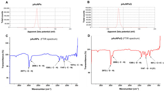 Characterization of plant cell derived gold nanoparticles (pAuNPs) with and without quercetin. The images show the characterization of nanoparticles for the zeta potential by Dynamic Light Scattering (DLS) in presence and absence of quercetin (panels (A,B)) instrument in a triplicate experiment. Further, the analysis of functional groups present in the plant cell-engineered gold nanoparticles with and without quercetin was carried out by Fourier-transform infrared spectroscopy (FITR; panels (C,D)).