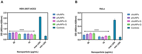 The potential cytotoxic side effect of the plant cell-derived (pAuNPs) and chemically synthesized (cAuNPs) gold nanoparticles with and without quercetin on the target cells was measured by the release of LDH—an enzyme that is an indicator of cellular toxicity [31]. In this experiment, pAuNPs and cAuNPs were pre-treated separately on HEK293T-ACE2 (Figure 4A) and HeLa cells (Figure 4B) using 10 µg/mL and 20 µg/mL dosages. As evident in Figure 4, the tested concentration of pAuNPs and cAuNPs showed minimal toxicity compared to the spontaneous release negative control and significantly less toxicity than the maximum LDH release represented by the positive control. Taken together, the concentrations of the pAuNPs and cAuNPs used in this study were non-toxic to cells.