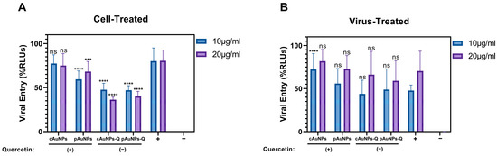 Pretreatment of target cells with pAuNPsQ and cAuNPsQ affects SARS-CoV-2 pseudovirus cell entry, but pretreatment of pseudovirus does not affect cell entry. (A). Monolayers of HEK-293T cells were preincubated with pAuNPs or cAuNPs with or without quercetin at 10 µg/mL and 20 µg/mL before transducing the target cells with SARS-CoV-2 (D614G) pseudovirus. (B). SARS-CoV-2 pseudovirus was pre-treated with 10 µg/mL or 20 µg/mL of gold nanoparticles followed by transduction of the target cell with the nanoparticle-treated pseudovirus. The untreated HEK293T-ACE2 cells transduced or infected with the SARS-CoV-2 pseudovirus were considered as a positive control (+), while the un-transduced HEK293T-ACE2 cells were considered as a negative control (−). Asterisks indicate a significant difference between the positive control and the cells treated with AuNPs (**** p < 0.0001, *** p < 0.0003, “ns” indicates not significant).