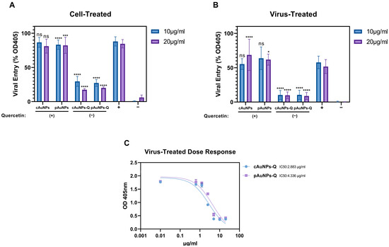 We next verified if the anti-SARS-CoV-2 activity of the pAuNPsQ and cAuNPsQ can also impact HSV-1, a medically significant virus commonly reported in dental practice [32]. We first pre-treated target HeLa cells individually with both quercetins conjugated or unconjugated nanoparticles for 1 h before challenging with the β-galactosidase reporter HSV-1 virus. The mock-treated and mock-infected cells were considered positive and negative controls, respectively. As shown in Figure 6A, only quercetin-conjugated nanoparticles (pAuNPsQ and cAuNPsQ) inhibited the HSV-1 cell entry in a dosage-dependent manner. In a parallel experiment, we also tested the effect of both unconjugated and conjugated nanoparticles on virus neutralization. In this assay, the nanoparticles were pre-mixed with the virus in a dosage-dependent manner for an hour before challenging the target HeLa cells. The mock-treated virus and the mock-infected HeLa cells were kept as positive and negative controls, respectively. As shown in Figure 6B, quercetin-conjugated pAuNPsQ and cAuNPsQ retained the anti-HSV-1 activity. Interestingly, both quercetin-conjugated pAuNPsQ and cAuNPsQ showed more significant blockage than in the cell treatment assay (Figure 6A). Since quercetin-conjugated pAuNPsQ and cAuNPsQ displayed higher antiviral potency between 10–20 µg/mL, we decided to generate Ic50 value for both the pAuNPsQ and cAuNPsQ using reporter beta-galactosidase based HSV-1 entry assay. In this assay, HSV-1 (gL86) was exposed to the conjugated nanoparticles independently using a serial dilation (10–0.01 µg/mL) method before challenging to target HeLa cells. The sigmoidal curve (Figure 6C) generated from this experiment showed that pAuNPsQ and cAuNPsQ had IC50 of 4.33 µg/mL and 2.88 µg/mL, respectively.