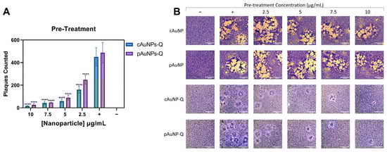 Vero cells were grown to confluence overnight in a 12-well plate and pre-treated with pAuNPsQ and or cAuNPsQ in a dosage-dependent manner (10, 7.5, 5, 2.5 µg/mL) for 1 h at 37 °C in 5% CO2 for pre-treatment experiments. Following treatment, cells were incubated with a 0.1 MOI HSV-1 (KOS-804) syncytial mutant [57] for 2 h at low speed on a rocker. The virus inoculum was removed, and cell monolayers were washed 3× with PBS. Following infection, cells were incubated for 48–72 h in 1.5 mL overlay media containing DMEM supplemented with 1% heat inactivated FBS and 0.5% methyl cellulose. For post-infection treatment, cells were infected for 2 h with 0.1 MOI HSV-1, washed 3× in PBS, and overlaid with 1% heat-inactivated FBS and 0.5% methyl cellulose containing dilutions of nanoparticles (10, 7.5, 5, 2.5 µg/mL). Infected, untreated cells served as a positive control, while untreated, uninfected cells were used as a negative control in both experiments. After 48 h, when the cytopathic effect was observed, cells were washed 3× in PBS and fixed for 30 min in 4% paraformaldehyde. Cell monolayers were then stained with Giemsa (Sigma, St. Louis, MO, USA), and plaques were counted under 10× magnification. Images of plaques were captured using the EVOS FL auto imaging system (ThermoFisher, Waltham, MA, USA), under 4× magnification.
