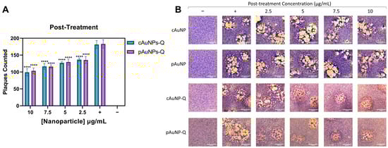 A post-infection treatment setting was investigated to determine if pAuNPsQ and cAuNPsQ had any effect on an established infection. In this experiment, target Vero cells were first infected with the virus for two hours, followed by exposure to the quercetin-conjugated nanoparticles in overlay media in a dosage-dependent manner. As indicated in Figure 8A, the post-treatment also significantly decreased the number of plaques in a dosage-dependent manner compared to the mock-treated positive control. Upon visualization in Figure 8B, plaque numbers and sizes were reduced, even in a post-infection treatment model. These results were impressive as they support the multifunctional properties of quercetin-conjugated nanoparticles affecting multiple stages of virus infection and under varying conditions of infection. The observed results demonstrate that blocking HSV-1 entry and replication by plant-derived nanoparticles can have both prophylactic and therapeutic applications.