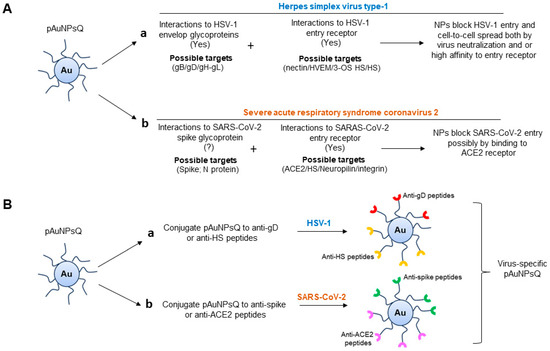 Possible mechanism by which plant cell derived gold nanoparticles conjugated to quercetin (pAuNPsQ) inhibits virus–host cell interactions. (A) Quercetin-conjugated gold nanoparticles block HSV-1 entry by interacting with the HSV-1 entry glycoprotein and/or targeting host cell receptors, as evident from our virus neutralization and cell pre-treatment assays (sub panel (a)). Since multiple viral glycoproteins and host cell receptors are involved in facilitating HSV-1 entry, the actions by pAuNPsQ could be predicted to be pleiotropic in nature, having an affinity for one or more HSV-1 envelope virus glycoproteins (gB, gD, gH-gL) as well as for one or more host cell receptors. In contrast, quercetin-conjugated gold nanoparticles did not affect SARAS-CoV-2 neutralization, while pre-treatment with quercetin conjugated gold nanoparticles inhibited SARS-CoV-2 entry suggesting the possible interactions between pAuNPsQ with the host cell surface ACE2 receptor (sub panel (b)). (B) The proposed development of virus-specific gold nanoparticles can be generated by conjugating pAuNPsQ to the virus-specific anti-envelope glycoprotein D (gD) peptides in case for HSV-1 (sub panel (a)). Similarly conjugating pAuNPs to anti-spike envelope proteins could be used for the development of robust anti-SARS-CoV-2 agent (sub panel (b)). In addition, tagging quercetin-based gold nanoparticles with anti-host cell receptor peptides (anti-heparan sulfate or anti-ACE2) can equally be tailored for their antiviral activity against specific viruses.