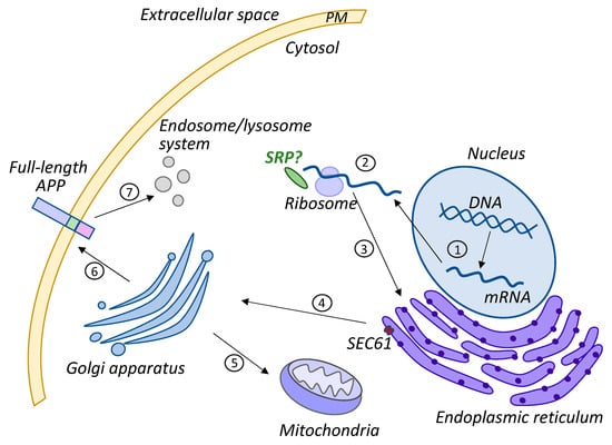 Intracellular APP trafficking. (1) APP transcription in the nucleus and mRNA export to the cytoplasm. (2) APP mRNA translation on a ribosome with the assistance of SRP or unestablished targeting factors (no experimental evidence of SRP involvement yet, thus, it is indicated by a question mark). (3) The transport of nascent APP to ER for further biogenesis. (4) The transition to Golgi for post-translational modifications. (5) The transport of full-length APP to mitochondria and the insertion into the mitochondria membrane. (6) The transport of full-length APP to the plasma membrane (PM). (7) The internalization of full-length APP into the endosomal system for further cleavage.