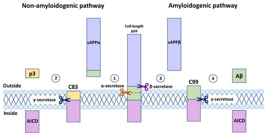 APP processing is a multistep mechanism that involves several cleavage events to release different products. APP biogenesis can be divided into distinct general steps, as shown in Figure 1.