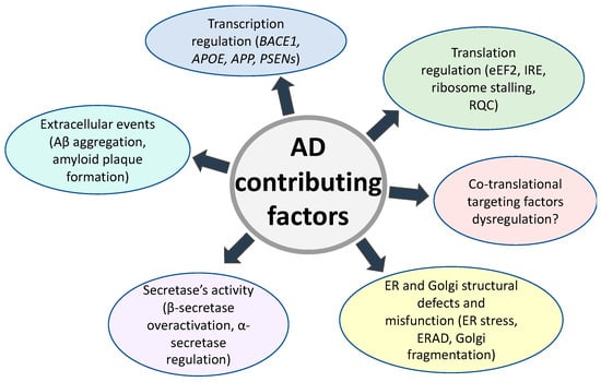 Defects in other stages of APP processing may also play a significant role in Aβ accumulation and aggregation. It was shown that alterations to APP mRNA translation can happen in the initiation and elongation steps. Elongation factor eEF2, when phosphorylated, slows down protein synthesis and leads to ribosome stalling. In AD mouse models, the phosphorylation of eEF2 is enhanced, suggesting the involvement of this elongation factor in AD pathology development [137]. Another mechanism that was shown to alter APP mRNA translation is iron-dependent. It was demonstrated that patients with neurodegenerative disorders, such as Alzheimer’s or Parkinson’s disease, have an elevated level of iron in the brain [138]. Iron toxicity is connected to the generation of reactive oxygen species in the brain following oxidative stress and neuronal death [139]. The iron-responsive element (IRE) of APP mRNA was identified and shown to regulate APP protein expression. When iron is chelated in a neuroblastoma cell line, APP protein synthesis is drastically decreased, demonstrating the involvement of iron in the regulation of APP translation [140]. If ribosomes with an APP nascent chain are stuck in the ER during translation, this activates ribosome-associated quality control (RQC), triggering a down-stream cascade of reactions. Abnormal RQC causes endolysosomal misfunction, which leads to the formation of an amyloid plaque core intracellularly [55]. Yet, as mentioned before, the APP targeting factors are still unestablished, and this can be another aspect of APP processing that might contribute to AD development.