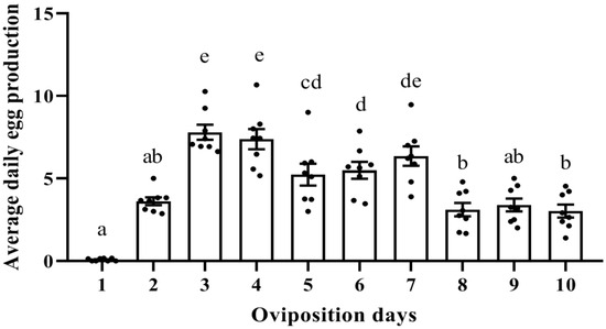 Average daily egg production (number of eggs per day and per mite) of female adult mites of T. urticae from the 1st day of the adult stage (=day 1) until death of the female mite at day 10. Every point represents a biological replicate and each replicate included 15 mites. In this experiment, we performed eight biological replicates per time point (day). The results are presented as mean (±SE) based on eight biological replicates per day. Lowercase letters above each column indicate significant differences amongst the ten days using one-way analysis of variance (ANOVA) followed by Tukey’s honestly significant difference (HSD) test (p < 0.05).