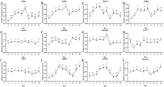 Expression pattern of the ecdysteroid biosynthesis Halloween genes (A–D) and the ecdysteroid signaling pathway genes (E–L) in female mites of T. urticae as determined by quantitative real-time PCR (RT-qPCR). The relative expression levels were calculated using the method of 2−ΔΔCT and based on the value of the lowest expression level. Lowercase letters above each bar indicate significant differences amongst the ten days using one-way ANOVA followed by a Tukey’s HSD test (p < 0.05).