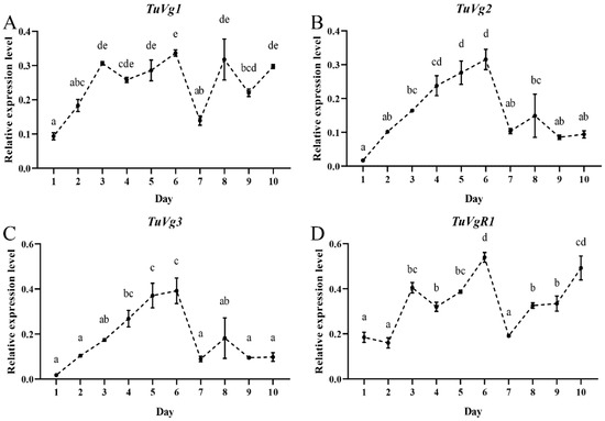 Expression pattern of the vitellogenesis-related genes, Vg (A–C) and VgR (D), in female mites of T. urticae as determined RT-qPCR. The relative expression levels were calculated using the method of 2−ΔΔCT and based on the value of the lowest expression level. Lowercase letters above each bar indicate significant differences amongst the ten days using ANOVA followed by a Tukey’s HSD test (p < 0.05).