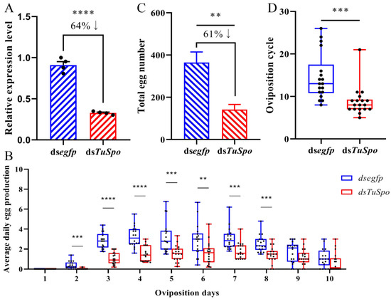 RNAi effects against TuSpo by injection in female mites of T. urticae. (A) The silencing efficiency of TuSpo was detected by RT-qPCR at 24 h after the female mites were injected with 60–80 ng of dsTuSpo. The mean (±SE) expression level is based on four biological replicates, and each replicate consisted of 50 mites. The relative expression was calculated based on the value of dsefgp (control). The down arrow indicates a decrease of 64% in relative expression of TuSpo. (B) Effects of dsTuSpo injection in female mites against the average daily egg production. Every point represented a small round leaf (2 cm diameter) with 5 mites on each leaf. The mean (±SE) average daily egg production is based on 18 biological replicates. (C) Effects of dsTuSpo injection in female mites on the total egg number. The mean (±SE) total egg number is based on four biological replicates, and we used 25 female mites per replicate. The down arrow indicates a decrease of 61% in total egg number. (D) Effects of dsTuSpo injection in female mites on the oviposition cycle. The mean (±SE) oviposition period is based on 18 biological replicates, and we used 5 mites per replicate. The significant difference between the two groups is indicated with ‘**’, p < 0.01, ‘***’, p < 0.001 and ‘****’, p < 0.0001 after a Student’s t-test.