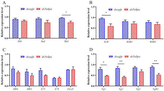 In this part, we investigated the RNAi effect of TuSpo on the expression of other ecdysteroid biosynthesis and pathway genes and also on that of the vitellogenesis-related genes by use of RT-qPCR. The expression levels of TuDib and TuSad showed no difference in the dsTuSpo-injected group, while that of TuShd was reduced by 22% (p = 0.0195) (Figure 5A). Similarly, the expression of the ecdysteroid receptor TuEcR was reduced by 38% (p = 0.0197), while there were no differences for TuRXR1 and TuRXR2 (Figure 5B). Also, for the ecdysteroid signaling pathway genes, there is no difference in the expression level of TuHR4, TuHR3, TuE75, TuE78, and TuFtz-f1 (Figure 5C). For the vitellogenesis-related genes, the expressions of TuVg1, TuVg2, and TuVgR1 were reduced by 40% (p = 0.0125), 50% (p = 0.0034), and 41% (p = 0.0041), respectively; for TuVg3, we also saw a small decrease in expression, but this was not significant (p = 0.0934) (Figure 5D).