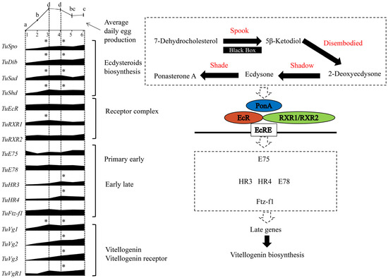 Scheme proposing the ecdysteroid biosynthesis and signaling cascade pathway regulating vitellogenesis and reproduction in T. urticae. Lowercase letters above the average daily egg production indicate significant differences during the first six days (day 1–6) in the adult stage using ANOVA followed by a Tukey’s HSD test (p < 0.05). ‘*’ indicates a significant difference of change during day 1–6 in the adult stage for the relative expression levels of the respective gene. Data on egg production and expression of genes are based on Figure 1, Figure 2 and Figure 3.