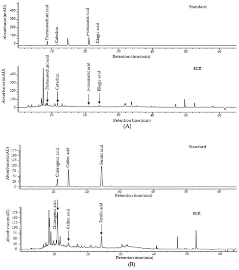 Chromatogram of major compounds of ECR at (A) 280 nm and (B) 320 nm.