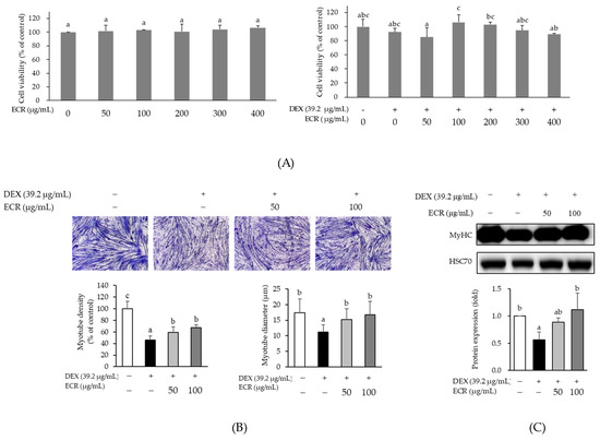 C2C12 cells (passages 4–17, CRL-1772; ATCC, Manassas, VA, USA) were incubated at 37 °C in a 5% CO2 atmosphere. The C2C12 cells were cultured in DMEM with 4500 mg/L D-glucose, 584 mg/L L-glutamine, 110 mg/L sodium pyruvate, 1200 mg/mL sodium bicarbonate, 100 Units/mL penicillin, 100 µg/mL streptomycin, and 10% FBS. For C2C12 differentiation, 9 × 104 cells were seeded and then, cells at 70–80% confluence were replaced with the differentiation medium containing DMEM supplemented with 2% horse serum for 6 days. The C2C12 cells were treated with ECR (50 and 100 µg/mL) and DEX (39.2 µg/mL) for 24 h. The assessments of ECR on cell viability were performed using 3-(4,5-dimethylthiazol-2-yl) (MTT; Duchefa Biochemie, Haarlem, The Netherlands) as previously described [53].