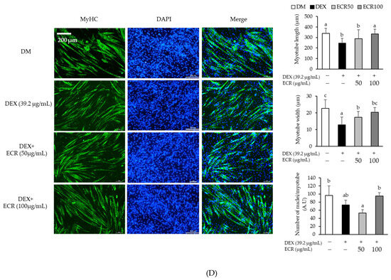 Effects of ECR on (A) cell viability, (B) myotube density and width, and (C) protein expression levels of MyHC. (D) Representative fluorescence image of myotube and graphs of myotube density, width, and number of nuclei in C2C12 cells (scale bar, 200 μm). Immunolabeling MyHC antibody (green). Nucleus stained with DAPI (blue). Different letters indicate significant differences by Duncan’s multiple range test (p < 0.05).