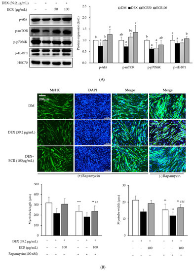 Effects of ECR on (A) the protein expression levels of p-Akt, p-mTOR, p-p70s6k, and p-4E-BP1 proteins. (B) Representative fluorescence image and myotube density and width by treatment of rapamycin (+/−) in C2C12 cells (scale bar, 200 μm). Immunolabeling MyHC antibody (green). Nucleus stained with DAPI (blue). Different letters indicate significant differences by Duncan’s multiple range test (p < 0.05). ** p < 0.01 and *** p < 0.001 compared with treatment of rapamycin (+/−) in each group. ## p < 0.01 and ### p < 0.001 vs. DEX treated cells.