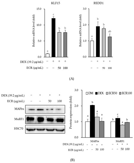 Effects of ECR on (A) mRNA expression levels of KLF15 and REDD1, and (B) protein expression levels of MAFbx and MuRF1 in C2C12 cells. Different letters indicate significant differences by Duncan’s multiple range test (p < 0.05).