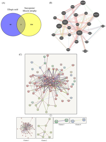Of the three reference values, we selected the compound that fit only two, i.e., the DL and OB values, while omitting the Caco-2 permeability value as seven compounds in ECR confirmed by HPLC did not match the values of DL ≥ 0.18, OB ≥ 30%, and Caco-2 ≥ −0.4 according to absorption, distribution, metabolism, and extraction (Table 1). Ellagic acid, as an active ingredient of ECR, met the above criteria, and its DL and OB values were 0.43 and 43.06%, respectively. We identified 20 targets for ellagic acid and 376 targets excluding pseudogenes for sarcopenia/skeletal muscle atrophy. We also confirmed the presence of overlapped two common elements, AKT1 and caveolin-1 (CAV1). The interaction score was determined to be of medium confidence 0.4. To assess and visualize the interactions between components and targets, we utilized Cytoscape version 3.10.0. The numbers of nodes and edges were 66 and 224, respectively. The average node degree and local clustering coefficient were 6.79 and 0.61, respectively. The p-value of protein–protein interaction enrichment was <1.0 × 10−16. Targets consisted of four clusters as follows: gene count was 43 and related proteins included AKT1, AKT1S1, AKT2, AKT3, AKTIP, CCDC28B, DDIT4, FAM110C, RLT3, GRB10, GRB7, ILK, IRS4, KIT, KITLG, MAPKAP1, MLST8, MTCP1, MUL1, OGT, PHLPP2, PIK3CA, PIK3CB, PIK3CD, PIK3CG, PIK3R2, PLEKHM3, PML, PPP2R5B, PRR5, RICTOR, RPTOR, SDCBP, TCL1A, TCL1B, THEM4, TRAF6, TRIB3, TRIM13, TTC3, WDFY2, YWHAB, and ZNF217 in red cluster 1; gene count was 8 and related proteins included CAV1, CAV2, DPP4, EMP2, PTRF, TENC1, UBXN6, WNT6 in yellowish green cluster 2; gene count was 2 and related proteins included MAGI2 and MAGI3 in green cluster 3; and gene count was 2 and related proteins included SPATA13 and TNK2 in blue cluster 4 (Figure 5). Of the 245 biological processes, 33 molecular functions, 23 cellular components in GO, and 112 pathways in KEGG were significantly enriched. The top 10 enrichment items on biological processes, molecular functions, and cellular components via the GO and KEGG pathways are shown in Table 2. The “Longevity regulating pathway-multiples species” was predominantly enriched in the KEGG database.