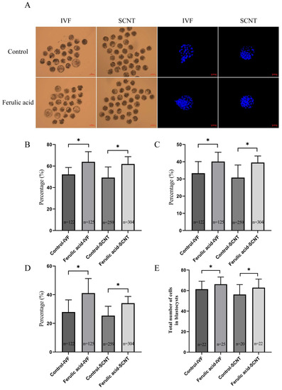 2.2. Ferulic Acid Supplementation Improves the Quality of Oocytes and the Developmental Potential of Subsequent Embryos