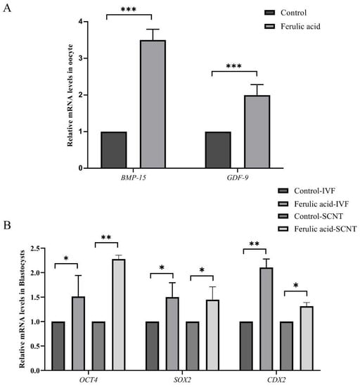 Ferulic acid improves the quality of oocytes and the developmental potential of subsequent embryos. (A) The relative mRNA levels of bovine oocyte maturation-related genes (BMP-15 and GDF-9); *** indicates that they significantly differed (p < 0.001). (B) Relative mRNA expression levels of IVF and SCNT embryo pluripotency-related genes (OCT4, SOX2, and CDX2); ** indicates that they significantly differed (p < 0.01), * indicates that they significantly differed (p < 0.05).