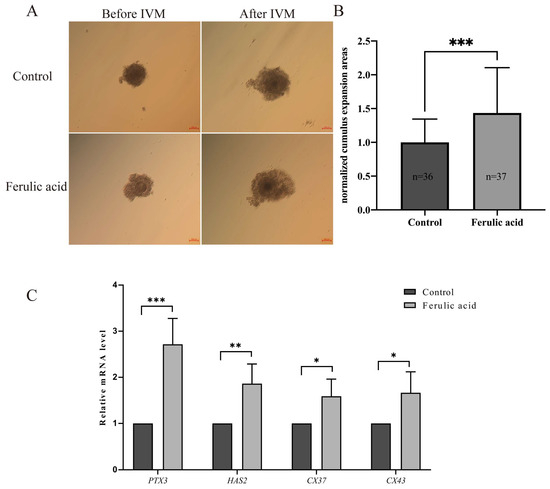 Ferulic acid promotes cumulus expansion during in vitro maturation. (A) Representative images of COCs in the control group and ferulic acid group before and after IVM. Scale = 100 μm. (B) ImageJ software was used to measure and calculate the statistics of the relative expansion area of cumulus cells; *** indicates that they significantly differed (p < 0.001). (C) The relative mRNA expression levels of expansion genes (PTX3, HAS2, CX37, and CX43) of bovine cumulus cells; * indicates that they significantly differed (p < 0.05), ** indicates that they significantly differed (p < 0.01), *** indicates that they significantly differed (p < 0.001).