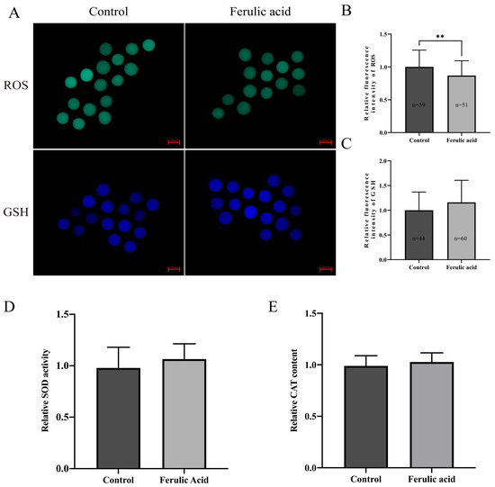 Ferulic acid improves the antioxidant capacity of bovine oocytes. (A) The oocytes of the MII stage control group and FA-treated group were exposed to DCHF-DA and CellTracker™ Blue CMF2HC staining, and the intracellular ROS and GSH levels were observed by fluorescence microscopy. Scale = 100 µm. (B) Analysis of the relative fluorescence intensity of the ROS signal with ImageJ software; ** indicates that they significantly differed (p < 0.01). (C) Analysis of the relative fluorescence intensity of the GSH signal with ImageJ software. (D) Relative SOD activity in oocytes of the control group and FA treatment group. (E) Relative CAT content in oocytes of the control group and FA treatment group.