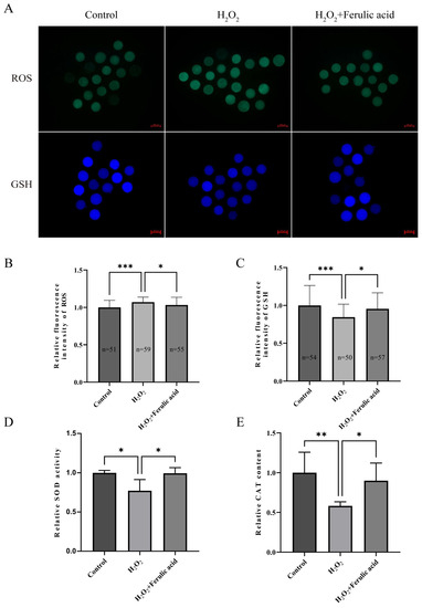 Ferulic acid improves the antioxidant capacity of bovine oocytes treated with H2O2. (A) The oocytes of the MII stage control group, H2O2 treatment group, and H2O2-FA co-treatment group were exposed to DCHF-DA and CellTracker™ Blue CMF2HC staining, and the intracellular ROS and GSH levels were observed by fluorescence microscopy. Scale = 100 µm. (B) Analysis of the relative fluorescence intensity of the ROS signal with ImageJ software; *** indicates that they significantly differed (p < 0.001), * indicates that they significantly differed (p < 0.05). (C) Analysis of the relative fluorescence intensity of the GSH signal with ImageJ software; *** indicates that they significantly differed (p < 0.001), * indicates that they significantly differed (p < 0.05). (D) Relative SOD activity in oocytes of the control group, H2O2 treatment group, and H2O2-FA co-treatment group, * significantly differed (p < 0.05). (E) Relative CAT content in oocytes of the control group, H2O2 treatment group and H2O2-FA co-treatment group; * indicates that they significantly differed (p < 0.05), ** indicates that they significantly differed (p < 0.01).