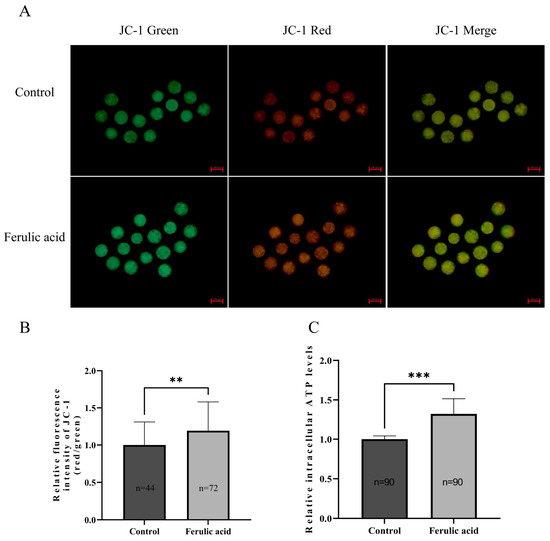 Ferulic acid improves the mitochondrial function of bovine oocytes. (A) The oocytes of the FA-treated group in the MII period were exposed to JC-1 staining, and the fluorescence intensity of JC-1 in the cells was observed by fluorescence microscopy. Scale = 100 µm. (B) ImageJ analysis of intracellular relative MMP levels; ** indicates that they significantly differed (p < 0.01). (C) The relative ATP level in oocytes of the control group and FA treatment group; *** indicates that they significantly differed (p < 0.001).