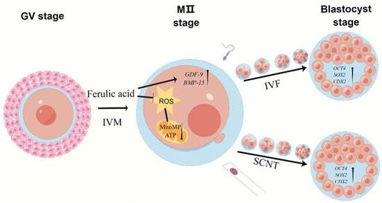 Diagram of ferulic acid enhancing bovine oocyte maturation and subsequent early embryo potential. During the IVM of bovine oocytes, supplementation with FA effectively reduced the level of intracellular ROS, resulting in improved mitochondrial function. Meanwhile, FA supplementation positively influenced the mRNA levels of GDF-9 and BMP-15 in oocytes, leading to enhanced oocyte quality. Moreover, it increased the mRNA levels of OCT4, SOX2, and CDX2 in IVF and SCNT blastocysts, thereby augmenting the developmental capacity of early embryos. Figdraw was used to make the diagram.