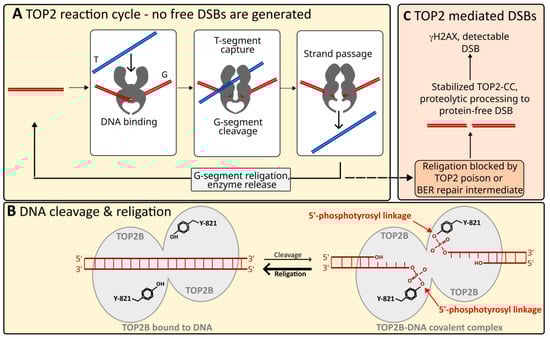 DNA topoisomerases are present in all organisms and catalyze strand passage reactions required to regulate DNA topology. This enables changes in DNA supercoiling state, and in the case of type 2 DNA topoisomerases such as vertebrate TOP2A and TOP2B, permits DNA (de)catenation and (un)knotting. These reactions are carried out via a transient enzyme-linked break in one DNA strand (Type I topoisomerases) or both strands (Type 2 topoisomerases). Typically, these DNA breaks remain buried within the enzyme, covalently attached to the catalytic tyrosine through a phosphotyrosine linkage, and are efficiently re-ligated by the enzyme after passage of a second strand or duplex through the enzyme-coupled break (Figure 1A,B). As a result, topoisomerase strand passage activity does not typically activate DNA damage signaling pathways and no DNA repair is required [1,2,3]. However, topoisomerases can generate more persistent DNA breaks if the religation step of their reaction cycle is inhibited. This occurs if the enzyme encounters specific types of DNA repair intermediate or drugs which permit the cleavage step but block religation (termed topoisomerase poisons, e.g., camptothecin (TOP1) or etoposide (TOP2)) [4]. For TOP2, the resulting stalled topoisomerase-DNA covalent complex (CC) is processed to a protein-free DSB (pf-DSB) which activates DNA damage signaling resulting in the phosphorylation of histone H2AX ser-139 (γH2AX, Figure 1C) [5].