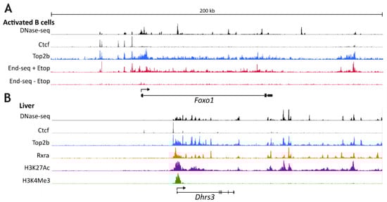 Unlike its paralogue TOP2A, TOP2B is dispensable for cell proliferation and early embryonic development [24,25]. However, while mice constitutively null for TOP2B can develop in utero, they were observed to die perinatally. This was due to failure to properly innervate the diaphragm [14]. Following this original study, others demonstrated essential roles for TOP2B in the later stages of neuronal development and in the immune system, specifically in B cell development [2,9,12,13,26,27,28,29,30]. While the role of TOP2B in these cases appears to be in establishing the correct expression of developmentally regulated genes, the mechanism/s involved are not clear. It was recently shown in a human neuroblastoma cell line model that genes downregulated in TOP2B null cells were enriched for very long genes (>200 kb) and for genes that are highly expressed in wild type cells [9]. The link with long genes and long neural genes in particular had been made previously [2,11,26,31], and suggests that TOP2B may be required for efficient transcription of long transcripts especially in post-mitotic neurons lacking TOP2A. However, since long genes are often associated with neuronal development, and some of the longest mammalian genes are neuronal specific [32], this association may reflect a particular importance of TOP2B in developmental gene expression rather than gene length. Furthermore, PAX5, a key B cell transcription factor gene that is under expressed in murine TOP2B hypomorphs [12], is also very long (over 185 kb). The implied requirement for TOP2B to overcome topological constraints of generating very long transcripts does not rule out involvement of TOP2B in other aspects of transcriptional regulation. For example, ChIP and ChIP combined with microarray analyses have demonstrated the presence of TOP2B at the promoters of its neural target genes in mouse tissue [33,34,35]. In fact, ChIP-seq data reveal that TOPB is generally enriched in and around promoter regions of genes [22,23], including PAX5 [12] and other B-cell regulators, including FOXO1 (Figure 2A). As alluded to above, a large proportion of CTCF ChIP-seq peaks correspond to peaks of TOP2B binding [22]. A pattern of TOP2B distribution observed for PAX5, FOXO1 and other genes consists of a sharp TOP2B peak corresponding to a site of CTCF binding, usually upstream of the TSS, embedded in a much broader region of TOP2B enrichment extending well into the body of the gene [12] (Figure 2A).