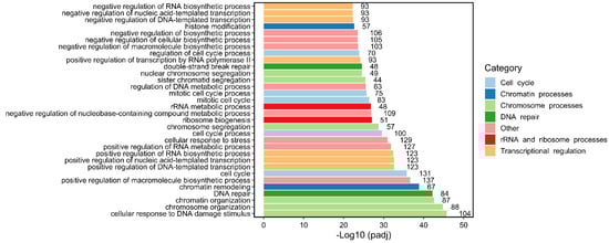 Gene set enrichment analysis (GSEA): Biological Processes most enriched amongst TOP2B interacting proteins. A non-redundant list of TOP2B interactors was compiled from previous publications and from querying BioGRID [52] and IntAct databases. This list was the input for GSEA analysis using g:GOSt functional profiling tool (https://biit.cs.ut.ee/gprofiler/gost (accessed on 10 January 2023)). The top 32 overrepresented Biological Processes (BPs) were plotted according to their significance (-Log10 multiple testing corrected p-value (padj)). The intersect size is shown to the right of each bar. BPs were manually placed into seven color-coded functional categories shown on the right.