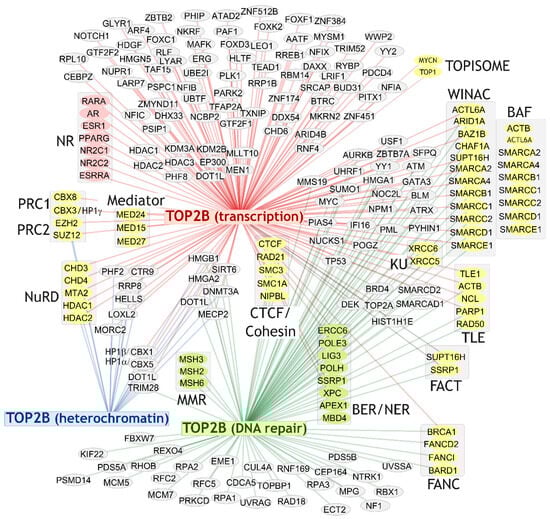 Transcription, DNA repair and heterochromatin—associated TOP2B interactors, complexes and pathways. TOP2B interactors contained in transcription, DNA repair or heterochromatin categories of Biological Processes (see Figure 3) are grouped according to their category, and further grouped (shaded boxes) according to membership of particular protein complexes (Topoisome, WINAC, BAF, TLE, FACT, NURD, PRC1/2, Mediator, KU, CTCF/Cohesin) or functional group/pathway (BER, NER, MMR, FANC, NR). Data were plotted using Cytoscape [55].