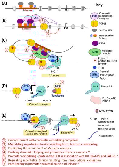 Model depicting potential modes of action of TOP2B in transcription. A simplified model for transcriptional activation by RNA pol II, highlighting points where TOP2B could potentially have a functional role (indicated by red numerals inside circles defined at the bottom of the diagram). (A) Gene in an “off” state, some transcription factor binding in an upstream enhancer, but these are associated with corepressors. (B) Early stage of transcriptional activation. Corepressors replaced by coactivators/s such as P300 along with binding of further TFs to the enhancer. The resulting histone acetylase and nucleosome remodeling activities (purple arrows) make chromatin structure more available to other factors including the basal transcription machinery but may also generate or be hindered by superhelical stress [64,65], requiring the action of topoisomerases. (C) Recruitment of Mediator and chromatin looping facilitates promoter–enhancer contacts, the recruitment of GTFs and PIC assembly (including RNA pol II). (D) Transcription initiation and promoter escape. The elongating polymerase generates +ve torsional stress ahead and -ve torsional stress behind [7,8,10]. (E) The initiation of transcription may be followed by transcriptional pausing a short distance downstream from the TSS [38,42]. Transcription, particularly of high output genes, generates DNA torsion and supercoiling that if not relieved by topoisomerase action could impede elongation by RNA pol II. Similarly, topoisomerases are required to manage (-) torsional stress propagating behind the early elongating polymerase into the promoter region [8,10]. The combined action of TOP1, TOP2 and MYC/MYCN in a protein complex coined the Topoisome may contribute to controlling this torsional stress [50]. Points where a pf-DSB could be envisaged to play a mechanistic role are highlighted with an asterisk.