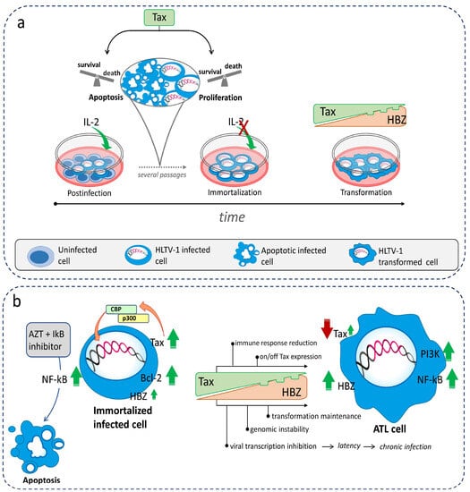 Schematic representation of (a) the outcome of HTLV-1 infection in vitro leading to immortalization/transformation and (b) the essential processes of leukemogenesis leading to ATL in HTLV-1-infected cells. The fragmented lower edge of Tax expression at low levels and the small green arrow for Tax in ATL cells in (b) show that Tax can be sporadically turned on and off during leukemogenesis.