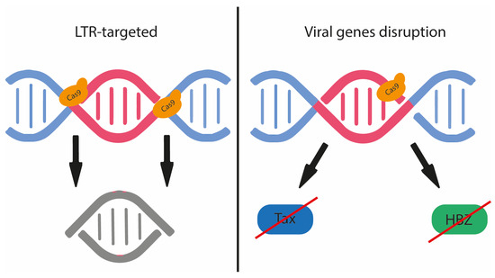 Although retroviral proviruses are largely restricted to HIV-1, HTLV-1 offers more sites for gRNA targeting than HIV-1 due to its highly conserved viral genome with remarkable sequence homogeneity. Moreover, as shown in Figure 3, CRISPR/Cas9 can disable both latent and actively replicating HTLV-1 and abrogate the function or expression of viral Tax and HBZ, which are the main drivers of HTLV-1-mediated transformation and proliferation. Targeting the viral LTRs involved in viral genome integration and gene expression may allow the effective treatment of HTLV-1-infected individuals, asymptomatic carriers, and ATL and HAM/TSP patients. The careful design of gRNAs that disrupt two viral elements simultaneously can disrupt overlapping reading frames between HBZ and the 3’LTR and Tax and the 3’ LTR [110].
