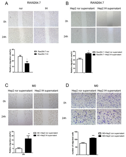 The supernatant of laryngeal cancer cells exposed to IH promoted macrophage migration. (A) Wound-healing assay of Raw264.7 cells in a normal or IH microenvironment (100×). (B) Wound-healing assay of Raw264.7 cells treated with Hep2 cell culture supernatant in a normal or IH microenvironment (100×). (C) Wound-healing assay of M0 macrophages treated with Hep2 cell culture supernatant in a normal or IH microenvironment(100×). (D) Transwell migration assays were conducted in M0 macrophages treated with Hep2 cell culture supernatant in a normal or IH microenvironment (100× and 200×). The data are presented as the mean ± SD values. * p < 0.05; ** p < 0.01; *** p < 0.001.