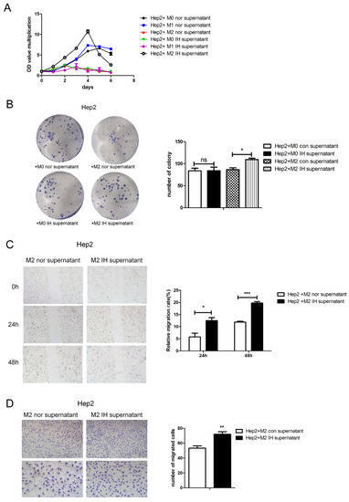 Culture supernatant from M2-type macrophages exposed to intermittent hypoxia increased the growth, proliferation and migration of Hep2 cells. Hep2 cells were treated with normal or IH-exposed M2-type macrophage supernatant, and the following assays were performed. (A) CCK8 assay showing the relative proliferation ability. (B) Representative images of the wells of 6-well plates in the colony formation assay; the statistical analysis is shown below. (C) Wound-healing assay (100×). (D) Transwell migration assay in Hep2 cells (100× and 200×). The data are presented as the mean ± SD values. ns p > 0.05; * p < 0.05; ** p < 0.01; *** p < 0.001.