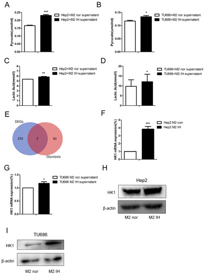 Intermittent hypoxia-exposed M2-type macrophage supernatant enhanced glycolysis and upregulated HK1 expression. (A–D) The lactate and pyruvate contents of laryngeal carcinoma cells were measured. (E) The intersection of DEGs and glycolysis-related genes is shown in a Venn diagram. (F,G) The HK1 mRNA level in laryngeal carcinoma cells treated with normal or IH-exposed M2-type macrophage supernatant was measured by qPCR. (H,I) Representative Western blot images showing HK1 protein levels. The data are presented as the mean ± SD values. * p < 0.05; ** p < 0.01; *** p < 0.001.