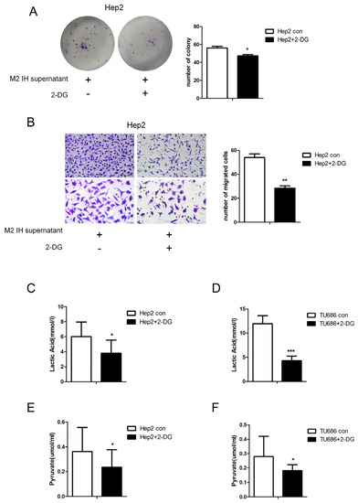 Treatment with the hexokinase inhibitor 2-DG attenuated the proliferation and migration of Hep2 cells induced by intermittent hypoxia-exposed M2-type macrophage supernatant. Hep2 cells were cultured in intermittent hypoxia-exposed M2-type macrophage supernatant and treated with 2-DG or solvent control, and the following assays were performed. (A) Colony formation assay. (B) Transwell migration assay (100×). (C,D) Lactate assay. (E,F) Pyruvate assay. The data are presented as the mean ± SD values. * p < 0.05; ** p < 0.01; *** p < 0.001.
