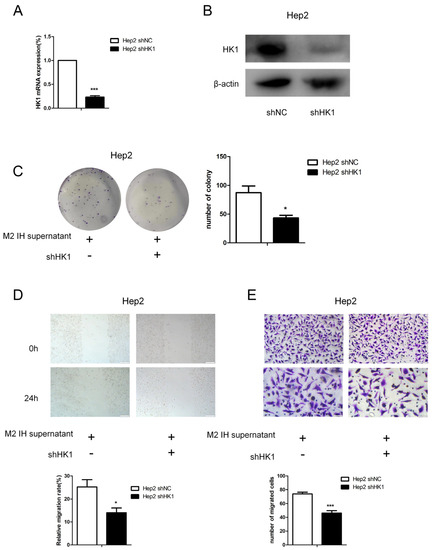 HK1 knockdown attenuated the proliferation and migration of Hep2 cells induced by intermittent hypoxia-exposed M2-type macrophage supernatant. (A,B) The results of qPCR and Western blotting confirmed HK1 knockdown in Hep2 cells. (C) Colony formation assay showing the proliferation of Hep2 cells transfected with shHK1 or shNC. (D,E) Wound-healing and Transwell migration assays were conducted in Hep2 cells transfected with shHK1 or shNC (100× and 200×). The data are presented as the mean ± SD values. * p < 0.05; *** p < 0.001.