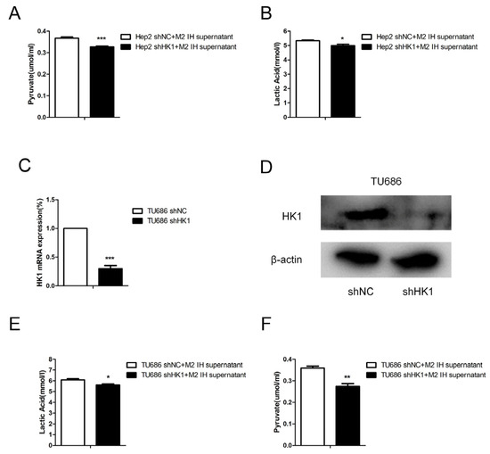 HK1 knockdown attenuated glycolysis induced by intermittent hypoxia-exposed M2-type macrophage supernatant. (A,B) Lactate and pyruvate assays were conducted in Hep2 cells transfected with shHK1 or shNC and incubated with culture supernatant from intermittent hypoxia-exposed M2-type macrophages. (C,D) The results of qPCR and Western blot confirmed HK1 knockdown in TU686 cells. (E,F) Lactate and pyruvate assays were conducted in TU686 cells transfected with shHK1 or shNC and incubated with culture supernatant from intermittent hypoxia-exposed M2-type macrophages. The data are presented as the mean ± SD values. * p < 0.05; ** p < 0.01; *** p < 0.001.