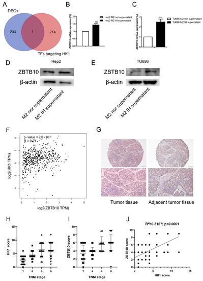 To investigate the potential mechanism of HK1, the GeneCards online database (https://www.genecards.org/, accessed on 3 August 2022) was used to search for transcription factors targeting HK1. Through the intersection analysis of transcription factors targeting HK1 and DEGs, ZBTB10 was screened out as the differently expressed transcription factor targeting HK1 (Figure 7A). It has been reported that ZBTB10 is involved in pyruvate kinase metabolism, which is a key process of the glycolysis response essential for cancer progression [28]. The RNA-seq results also revealed that the expression of the transcription factor ZBTB10 was elevated, and we confirmed that ZBTB10 mRNA and protein expression levels were elevated in both Hep2 and TU686 cells treated with conditioned medium, consistent with the RNA-seq results (Figure 7B–E). Then, after analysis with the GEPIA2 online database (http://gepia2.cancer-pku.cn/#correlation, accessed on 7 August 2022), we found that the expression of HK1 and ZBTB10 was positively correlated in head and neck tumors in data from the TCGA database (R = 0.21; p < 0.0001) (Figure 7F). We performed immunohistochemical staining of a tissue microarray containing 80 samples of human laryngeal cancer tissue to determine the expression patterns of HK1 and ZBTB10 (Table S1). We found that HK1 was highly expressed in laryngeal cancer tissues and was predominantly localized in the cytoplasm. ZBTB10 was highly expressed in laryngeal cancer tissues and localized in both the nucleus and cytoplasm (Figure 7G). Kruskal–Wallis one-way analysis of variance by ranks test revealed that the expression of HK1 and ZBTB10 was positively correlated with the TNM stage of tumors, i.e., higher grades were correlated with higher expression of HK1 and ZBTB10 (PHK1 < 0.001; PZBTB10 = 0.0001 < 0.001) (Figure 7H,I). In addition, Pearson correlation analysis showed that the HK1 expression level was positively correlated with the ZBTB10 expression level in the laryngeal cancer tissue microarray (R2 = 0.3157; p < 0.0001) (Figure 7J).